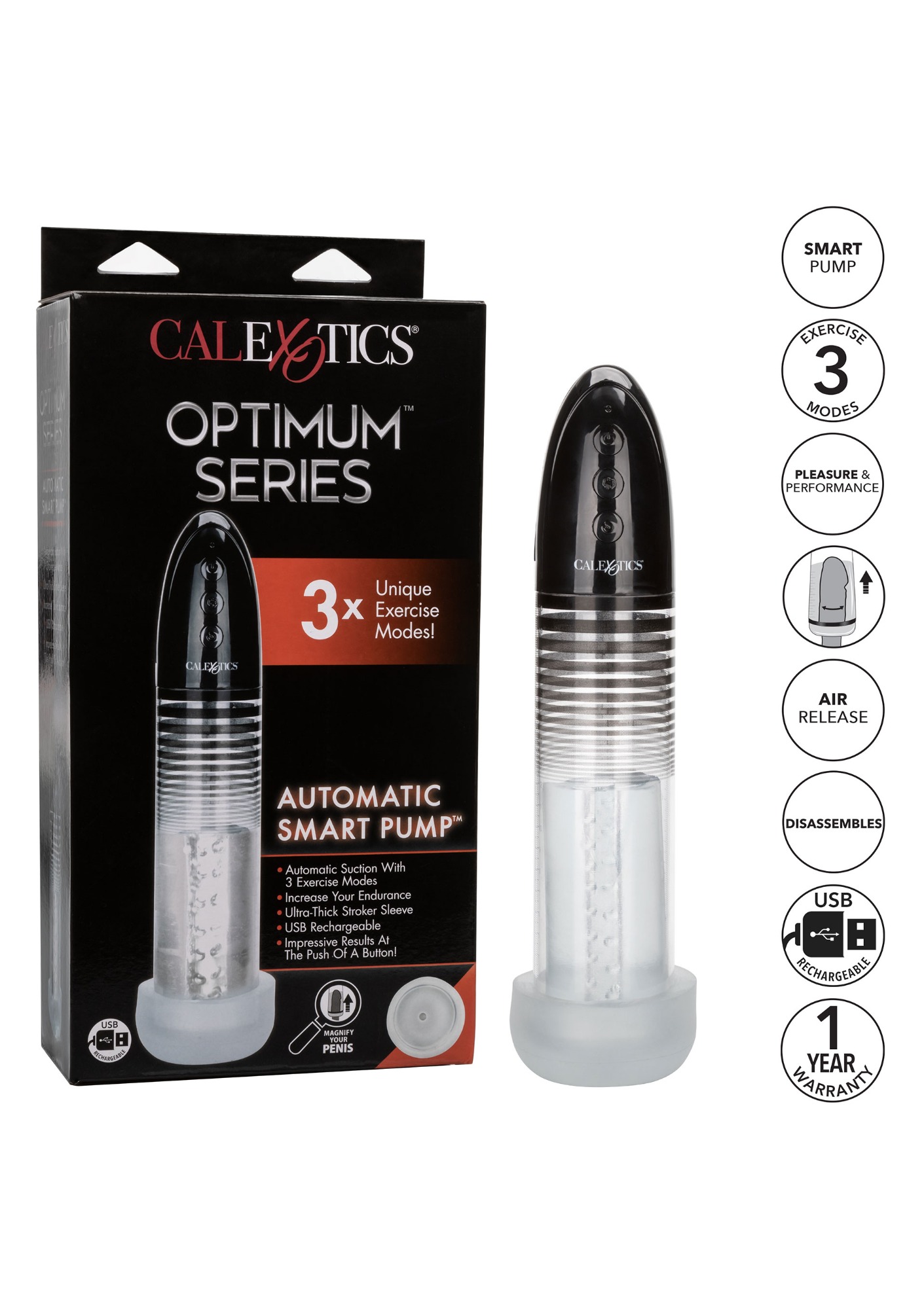 Suurenda oma naudingut automaatse nutika pumbaga. See on innovatiivne ja vastupidav meeste peenisepump, mis on loodud tugeva, automaatse imemise jaoks. Suurenda erektsioone, paranda vastupidavust ja treeni oma riista kolme ainulaadse treeningrežiimi abil. Stiilsel nutikal pumbal on lihtsad nupud ja õhu kiire vabastamise nupp. Varrukas on paks ja tihe, mis tundelt meenutab pigem masturbaatorit kui pumpa. Selle pumbaga ei pea sa leppima vähemaga, kui rääkida naudingust. Silindriline pump on vastupidav ja selle varrukas on loodud täiusliku tihendi ja võimsa imemise loomiseks ühe nupuvajutusega. Kui oled saavutanud pumba maksimaalse imemise, kasuta vaakumi vähendamiseks või tihendi vabastamiseks õhu kiirvabastust. Regulaarsel kasutamisel võib see võimas pump suurendada vastupidavust, suurendada üldist suurust ja võimendada sensatsiooni. Lae seda esmaklassilist pumpa kaasasoleva USB-laadimiskaabli abil 90 minutit, et nautida 60 minutit intensiivset stimulatsiooni või 80 minutit madala kiirusega imemist.