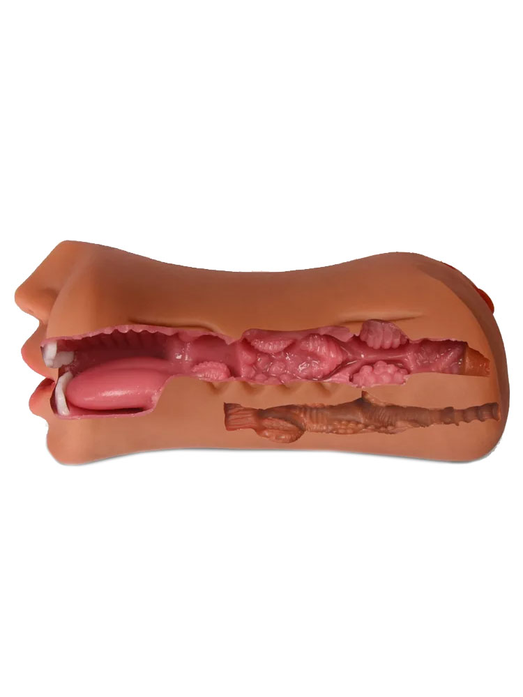 Kolm ühes masturbaator omab kolme anatoomiliselt küllaltki täpset auku. Suus on pehme keel ja kurgulaes realistlikud tekstuurid. Hambad on jäigemast materjalist kui ülejäänu, aga siiski pehmed ja kindlasti mitte ebamugavad. Suu on lõpust suletud disainiga ja sisenemisel tekkiv vaakum imiteerib oraalseksi.