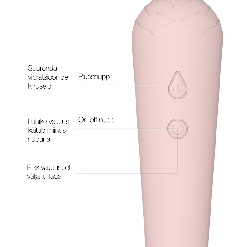 - Vibraatoril on 10 kiirust/mustrit, mille juhtimine on tehtud eriti minimalistlikuks ja lihtsaks. Lihtsalt vajuta ülemist nuppu, et minna järgmisele kiirusele ja alumist, et naasta eelmisele. Kui oled lõpetanud, siis vajuta pikalt alumist nuppu, et vibraator välja lülitada.